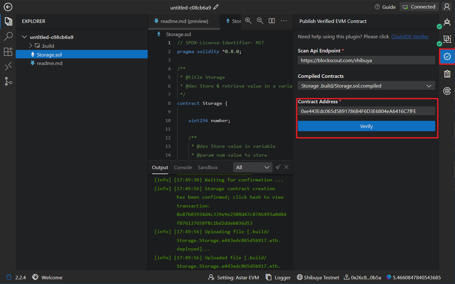 Click on the "Scan Verifier" plugin on the right, select the contract you want to verify, enter the deployed contract address, and click "Verify."