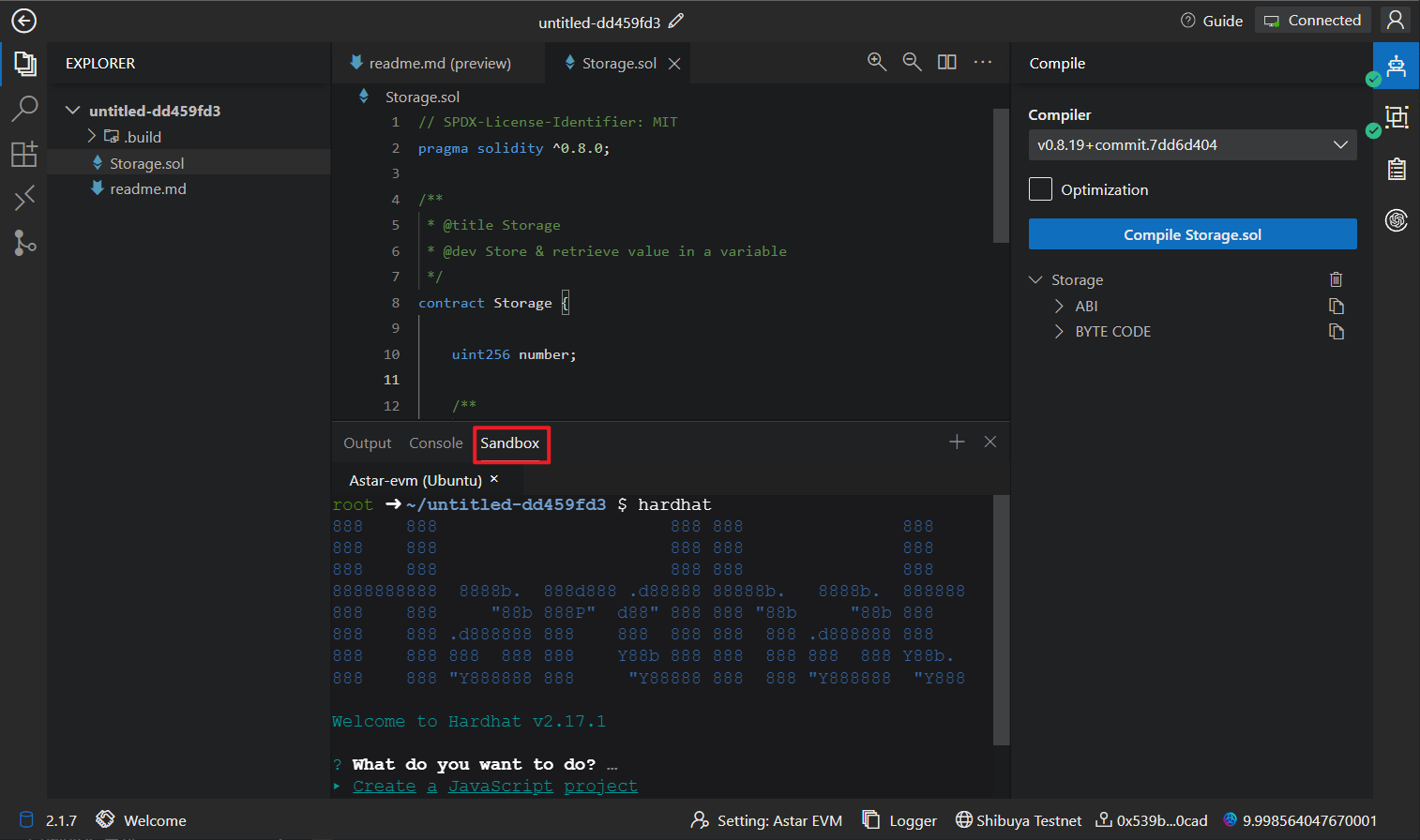 If you prefer using the command line for development, you can open the Astar EVM Sandbox, which comes pre-loaded with Hardhat, Truffle, Brownie Ganache, Git and Node.js V16.