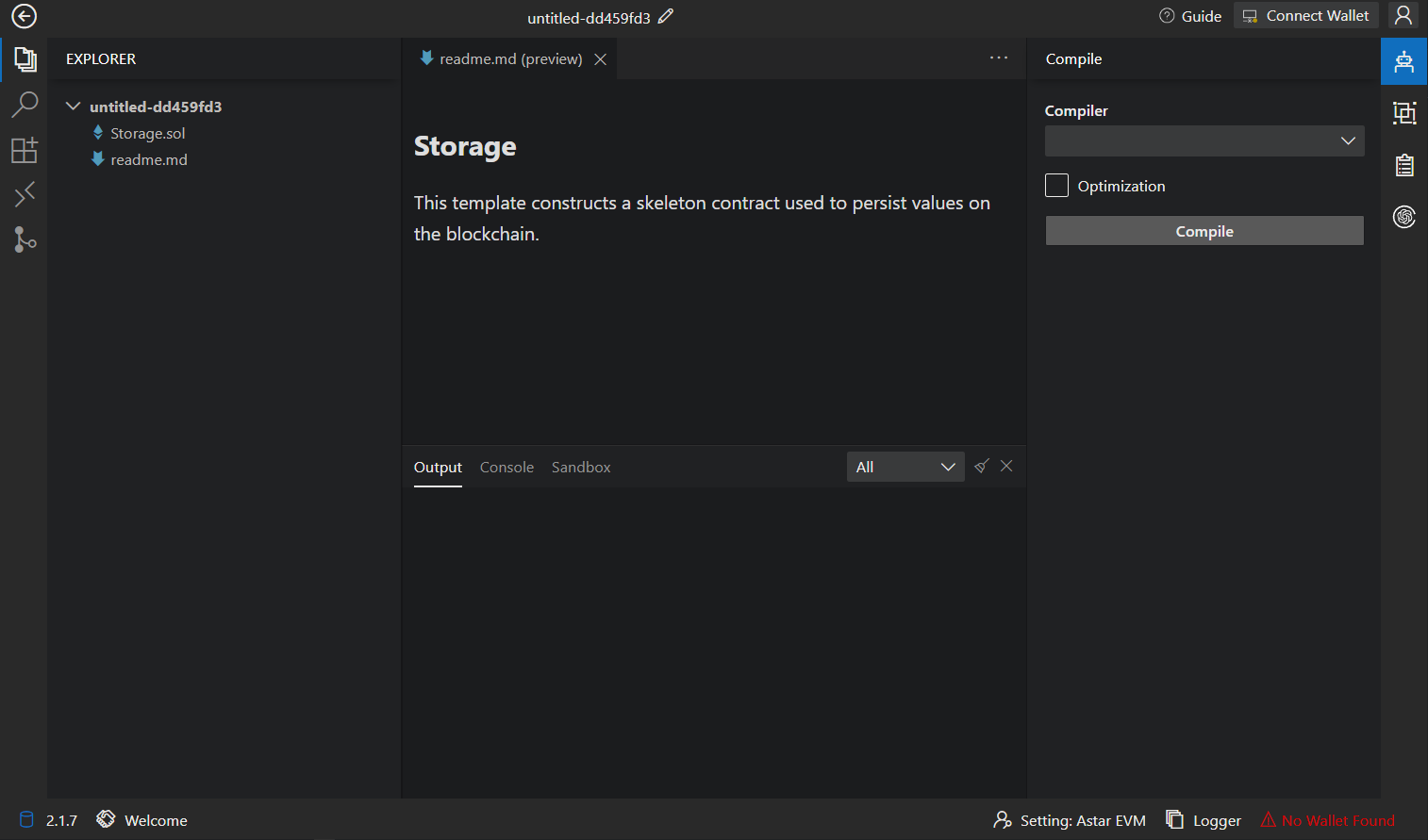 Astar EVM IDE provides developers with various basic or complex templates, such as Hello World, ERC-20, ERC-721, Hardhat dApp Wave, and more. Click to enter a template.