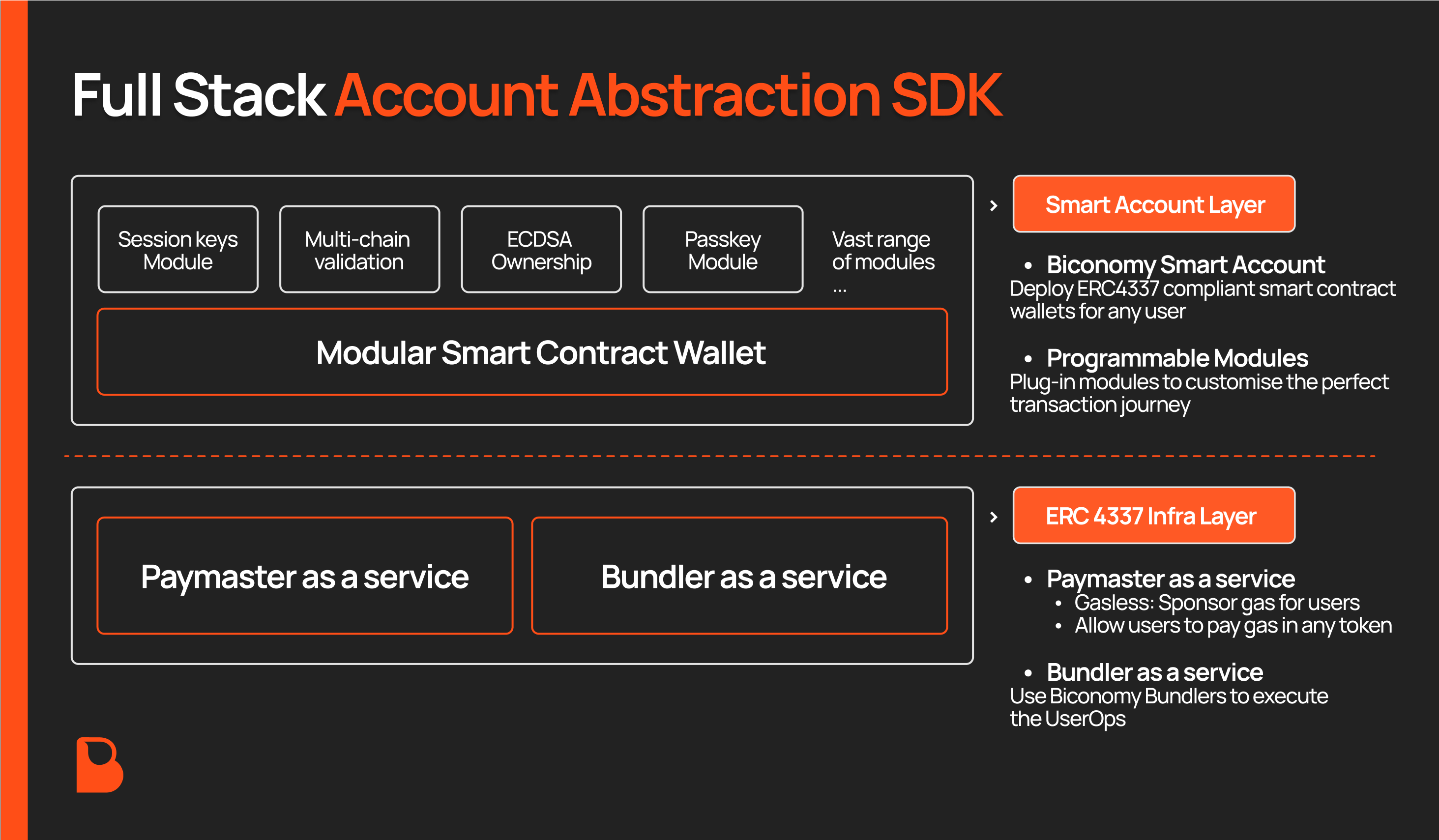 The Biconomy SDK is an Account Abstraction toolkit that enables the simplest UX on your dApp, wallet or appchain. Built on top of the ERC 4337 solution for Account Abstraction, we offer a full-stack solution for tapping into the power of our Smart Accounts Platform, Paymasters, and Bundlers.