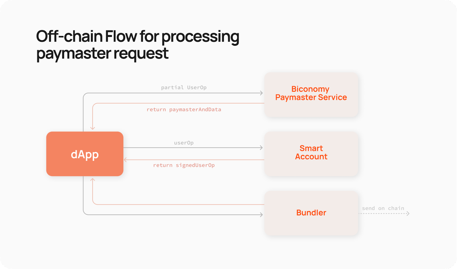 The Bundler is a service that tracks userOps that exist in an alternative mem pool and as the name suggests, bundles them together to send to an Entry Point Contract for eventual execution onchain. This is the final piece of the flow where after constructing your userOp and then potentially signing it with data from a paymaster, you send the userOp on chain to be handled and executed as a transaction on the EVM. You can start using our Bundlers right now in your dApps; each of our tutorials will walk you through how to use them in different scenarios.