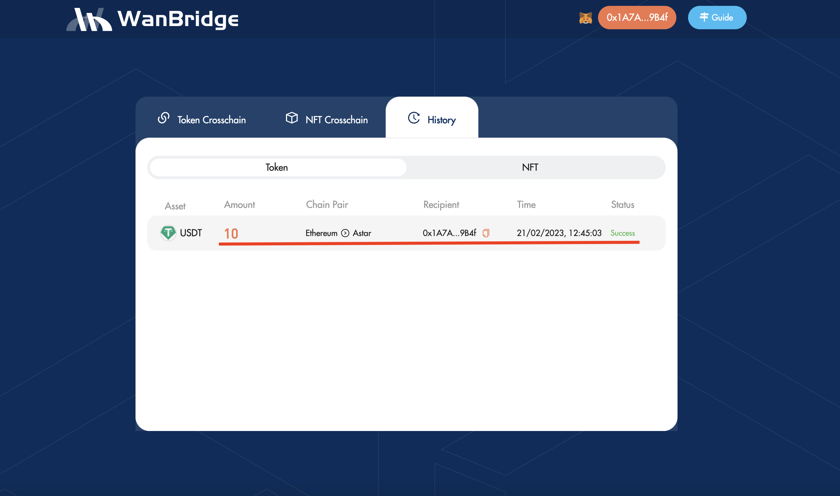 Once your cross-chain transaction is complete, you’ll see your $xcUSDT balance on Astar. The cross-chain transaction status will display as Success.