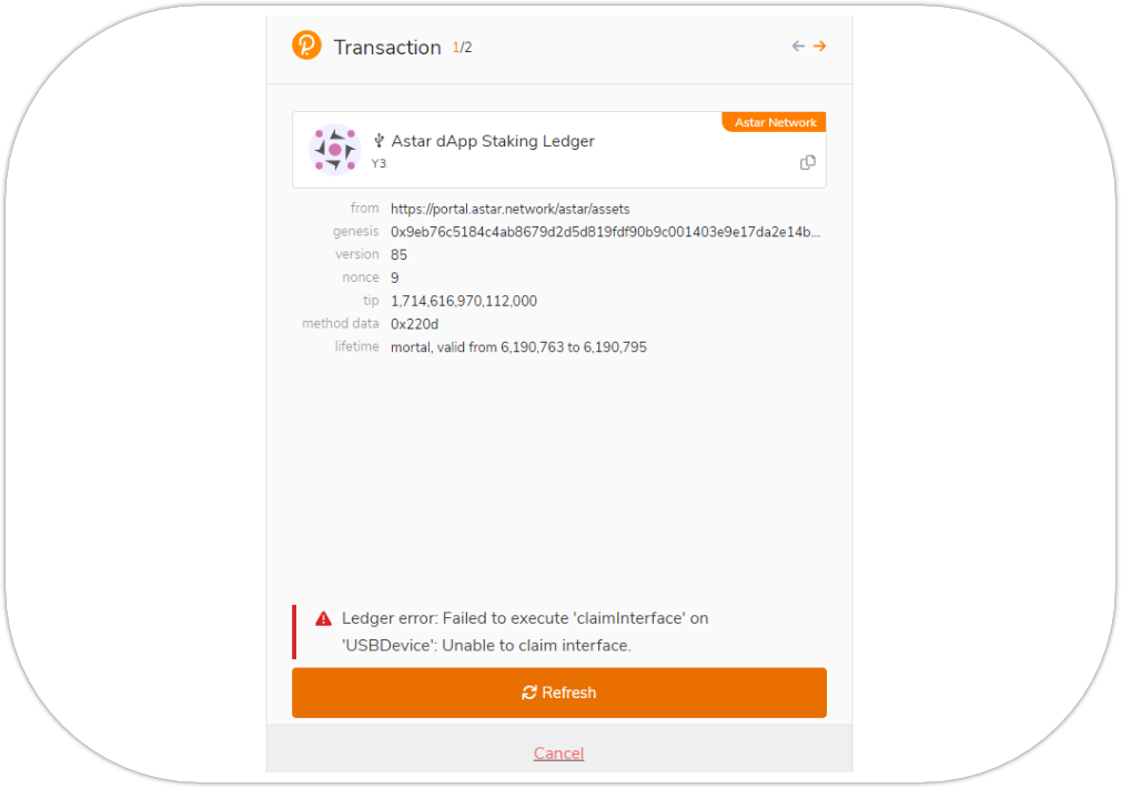 If you receive a Ledger error: Failed to execute 'claimInterface' on 'USBDevice': Unable to claim interface message during the dApp staking claim process, ensure you are performing the operation: