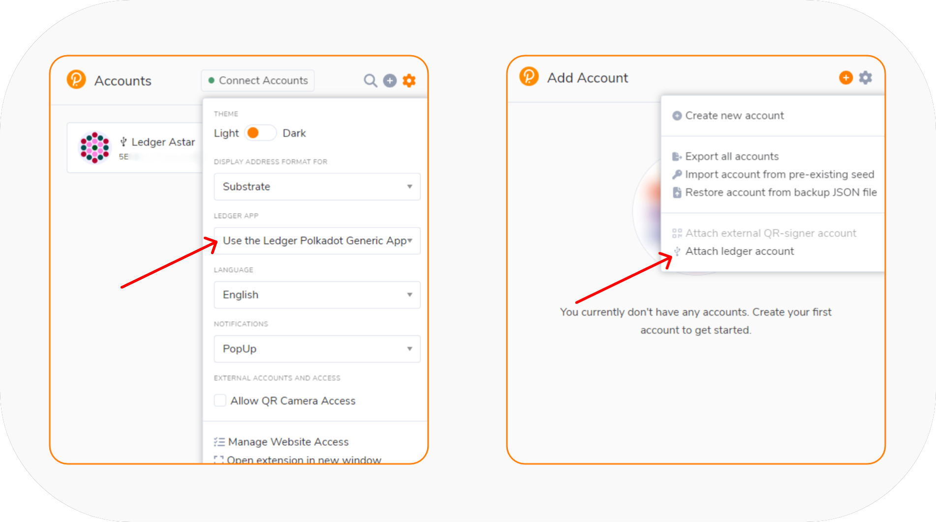 Use the Ledger Polkadot Generic Appin Ledger App setting; - Click on Attach Ledger account as shown below;