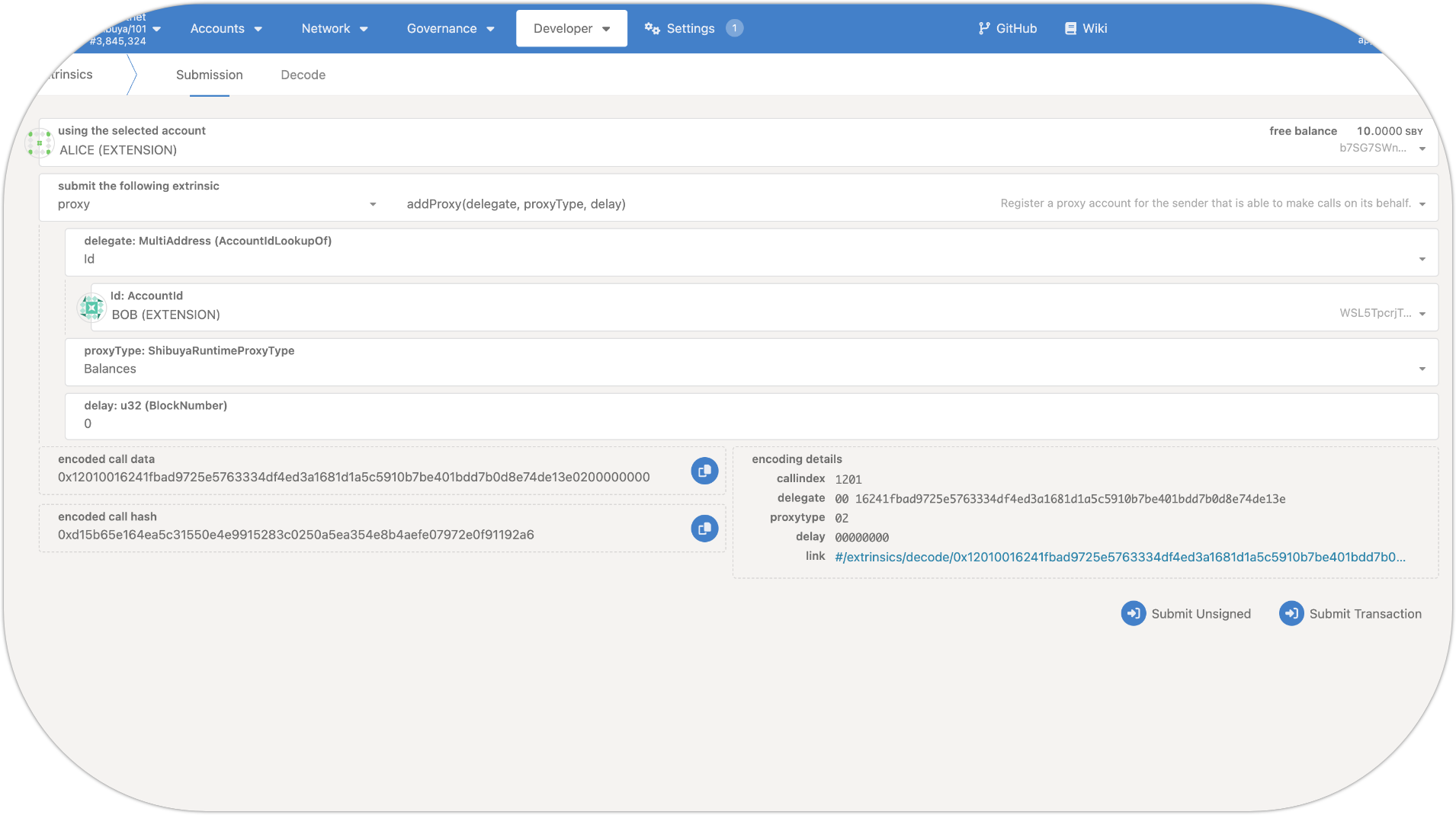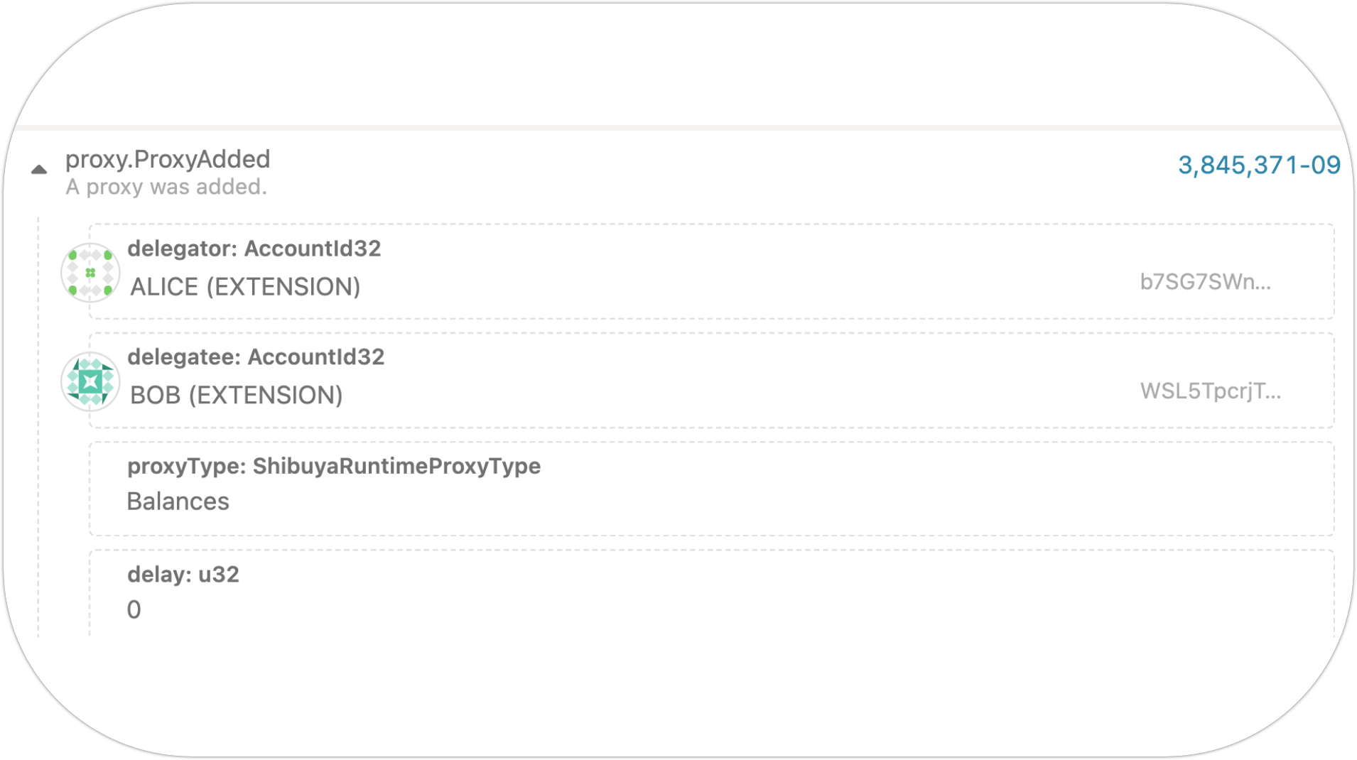 To enhance the security of proxies, we can implement a delay mechanism measured in blocks. A delay value of 10 corresponds to ten blocks, resulting in a delay of around two minute (for Astar network). The proxy will utilize the proxy.announce extrinsic to declare its intended action and will wait for the specified number of blocks according to the defined delay time before executing it.