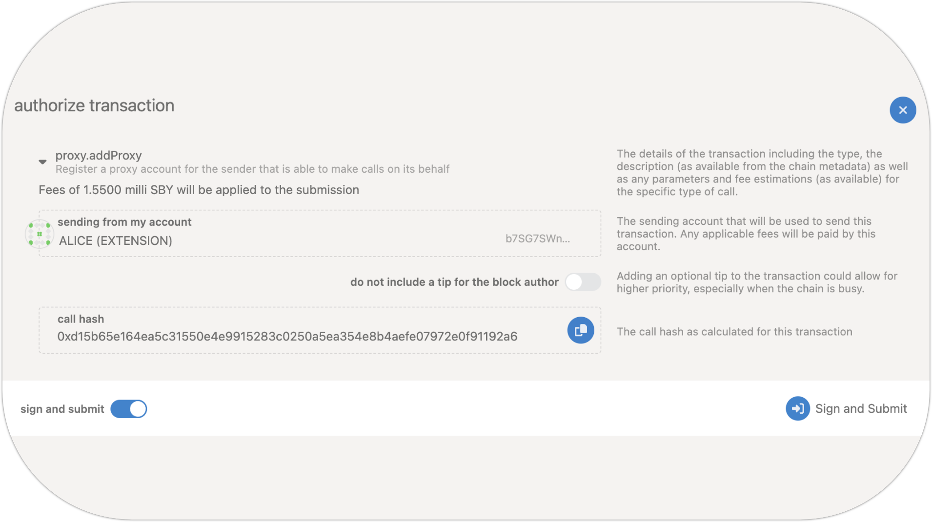 1. You will then be prompted to authorize and sign the transaction. Go ahead and click Sign and Submit to create the proxy relationship;