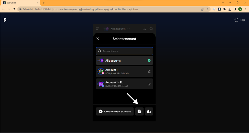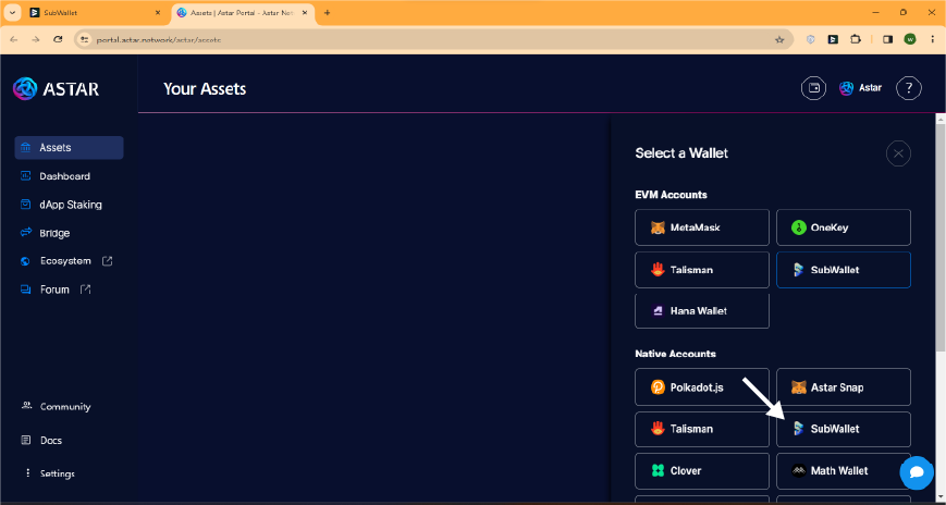 If you want to connect your Ethereum account, choose SubWallet under the Ethereum accounts section.