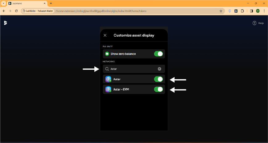 On the search bar, search for Astar. Toggle on the networks to enable them.