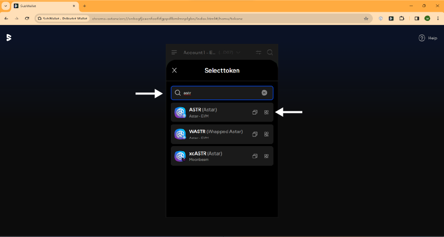 To Manage ASTR on SubWallet, choose the Customize asset display icon next to the search icon.