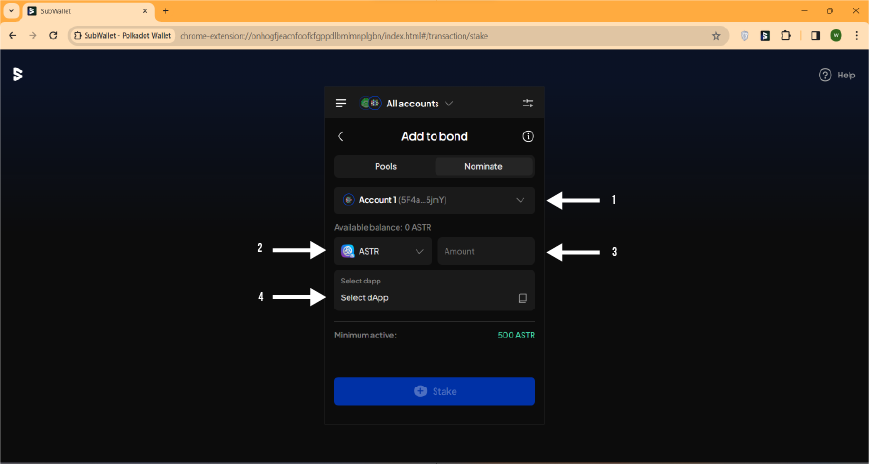 3. Enter the amount of tokens. The minimum active for dApp staking with ASTR is 500 ASTR.